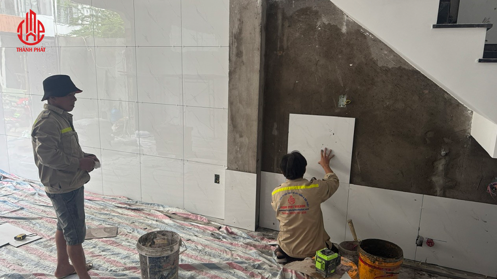 - Ốp gạch và trang trí: Ốp gạch tường, len chân tường, bả bột matit, xả nhám.