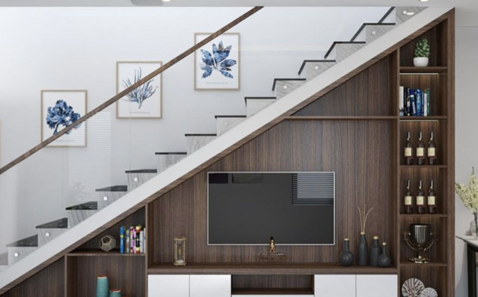 - Công năng sử dụng: Bạn có thể tận dụng tủ gầm cầu thang làm thành nơi trang trí, kệ sách, kệ đựng rượu hay thậm chí là tích hợp thêm bàn làm việc tiện lợi.