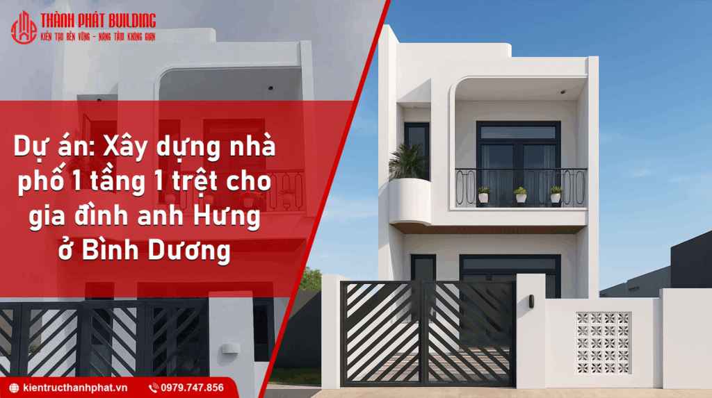 Dự án thi công xây nhà trọn gói nhà phố 2 tầng nhà anh Hưng ở Bình Dương. Dự án được hoàn thành với đội ngũ thợ chuyên nghiệp và kiến trúc sư kinh nghiệm của Kiến Trúc Thành Phát. Công trình được thiết kế theo phong cách hiện đại hứa hẹn sẽ mang đến một không gian sống đẳng cấp cho gia đình anh Hưng.