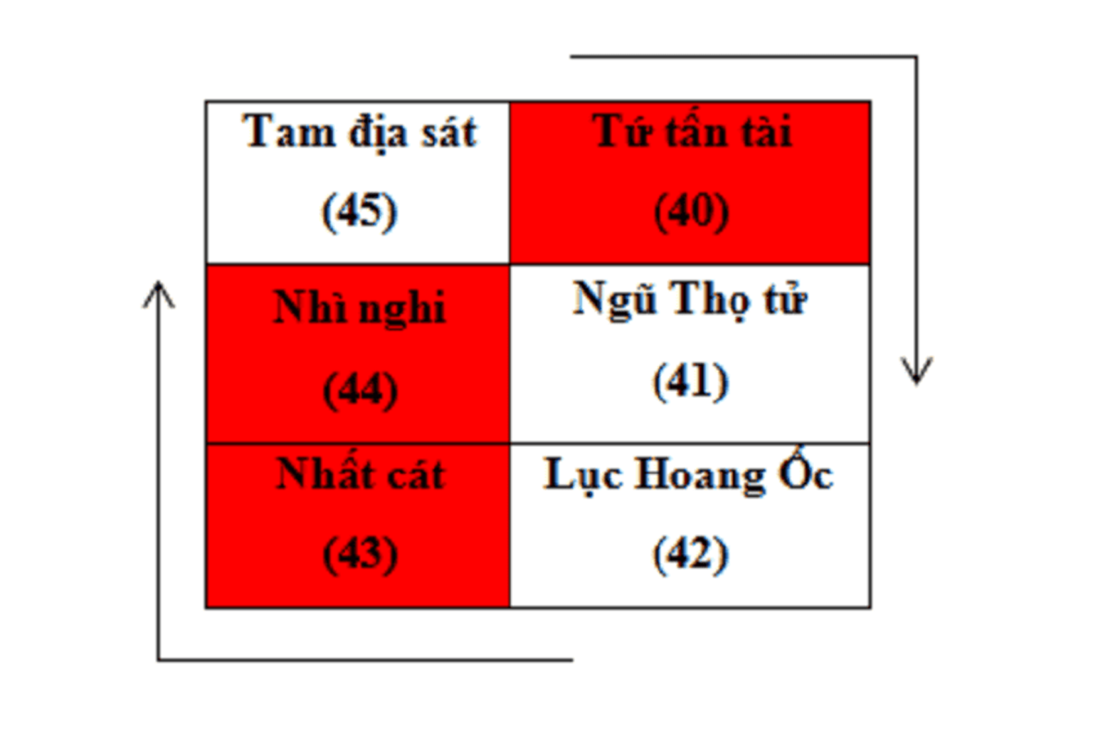 Ví dụ: Tính tuổi 45 có phạm hạn hay không? Lấy tuổi 40 tương ứng với Tứ Tấn Tài, theo chiều kim đồng hồ, 41 là Ngũ Thọ Tử, 42 là Lục Hoang Ốc, 43 là Nhất Cát, 44 là Nhì Nghi, và 45 là Tam Địa Sát. Vậy tuổi 45 phạm cung Tam Địa Sát xấu, cần tránh xây nhà.