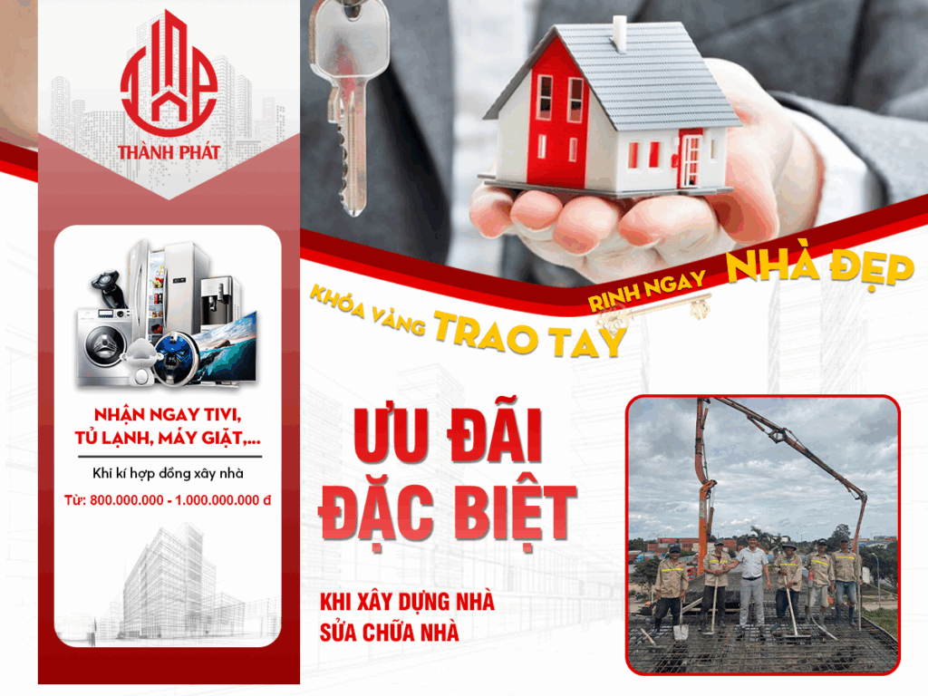 Nhân dịp năm 2025, Kiến Trúc Xây Dựng Thành Phát xin gửi đến quý khách hàng chương trình khuyến mãi đặc biệt khi ký hợp đồng xây dựng nhà phần thô, xây dựng nhà trọn gói, và sửa chữa nhà cũ. Đây là món quà tri ân sâu sắc chúng tôi muốn dành tặng cho sự tin tưởng và đồng hành của quý vị trong suốt thời gian qua.