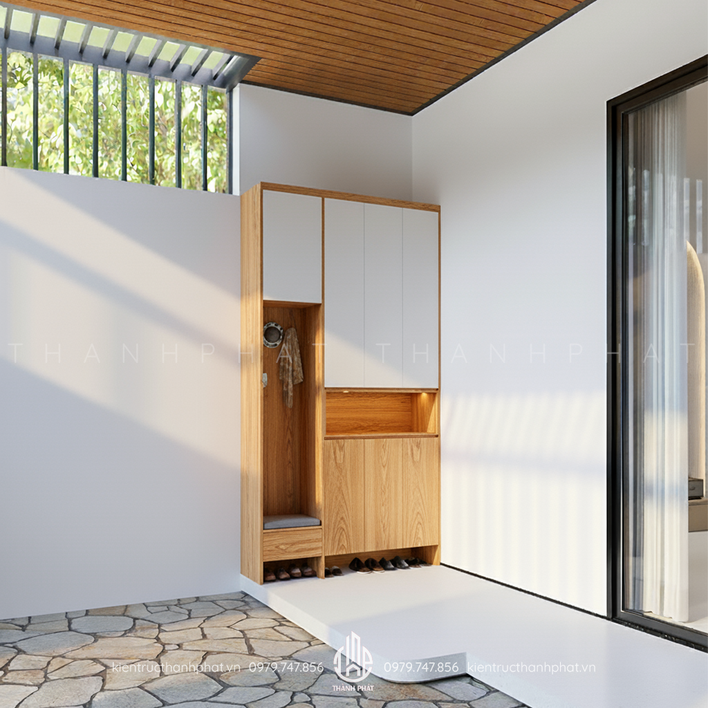 Phía trước sân nhà được bố trú tủ để dép và đồ dùng khác