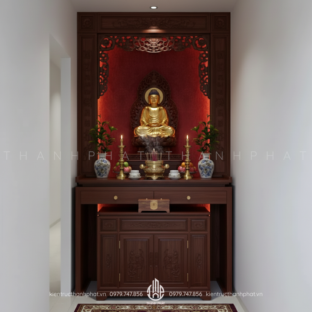 Phòng thờ với nội thất gỗ tạo không gian trang nghiêm, ấm cúng
