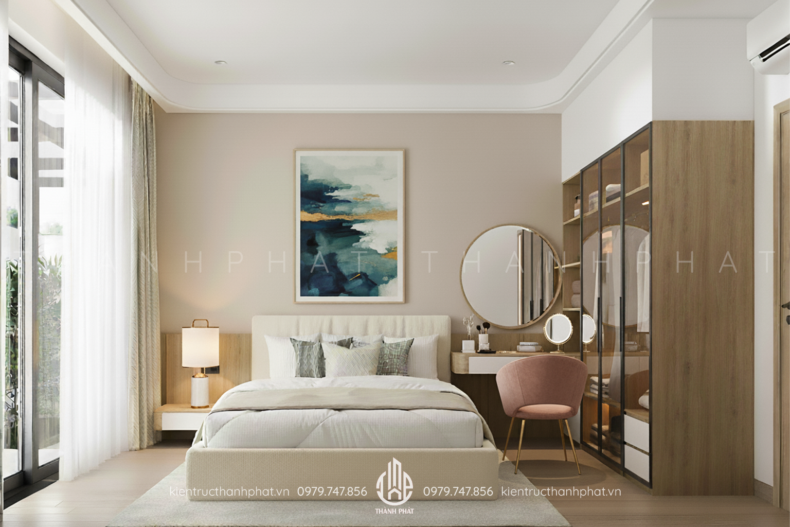 Phòng ngủ với hệ cửa kính lớn đón ánh sáng tạo cảm giác thông thoáng căn phòng