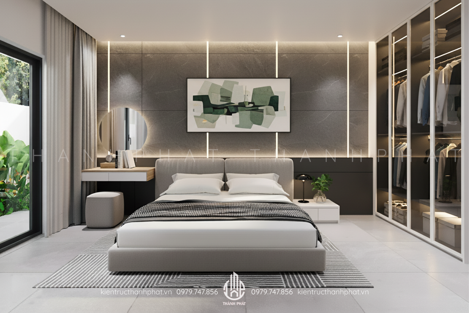 Phòng ngủ master thông thoáng với hệ cửa kính lớn