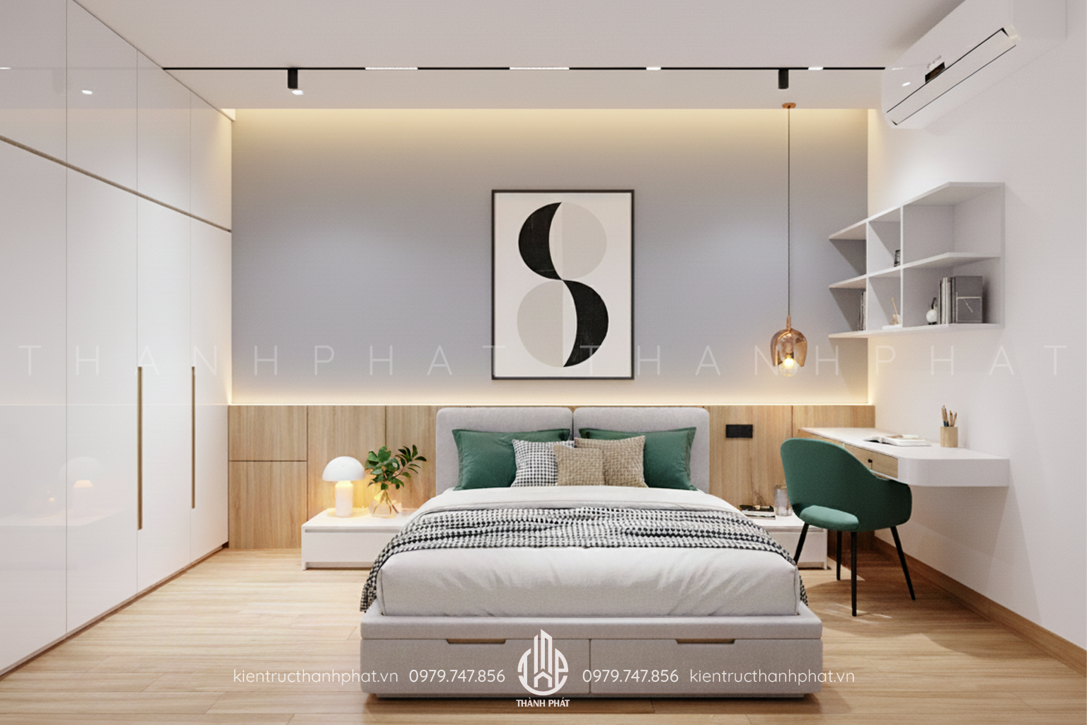 Phòng ngủ được bố trí hợp lý và thiết kế theo từng cá tính riêng biệt của các thành viên. Phòng ngủ master được ưu ái với cửa kính lớn, đón ánh sáng tự nhiên, tạo cảm giác thoáng đãng và tràn ngập năng lượng. Phòng ngủ con trai bé được thiết kế với màu sắc nhẹ nhàng, nam tính, trong khi phòng ngủ con trai lớn lại sử dụng gam màu trắng xám, thể hiện sự năng động, trẻ trung.