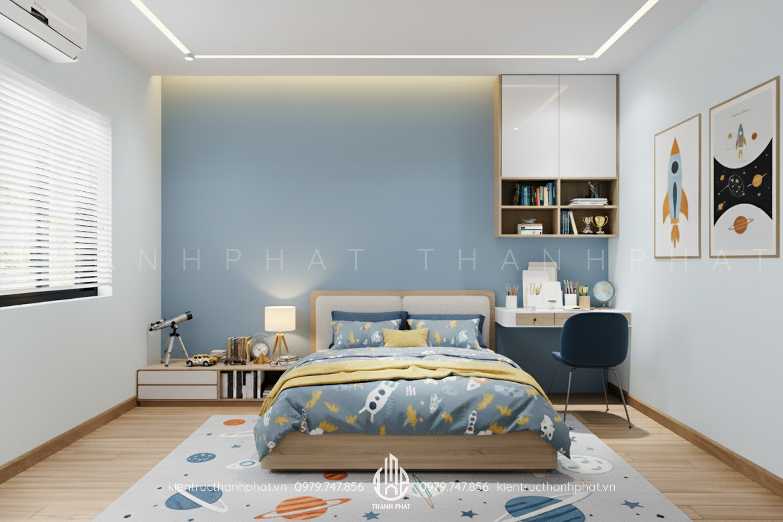 Phòng ngủ con trai bé với gam màu nhẹ nhàng nam tính