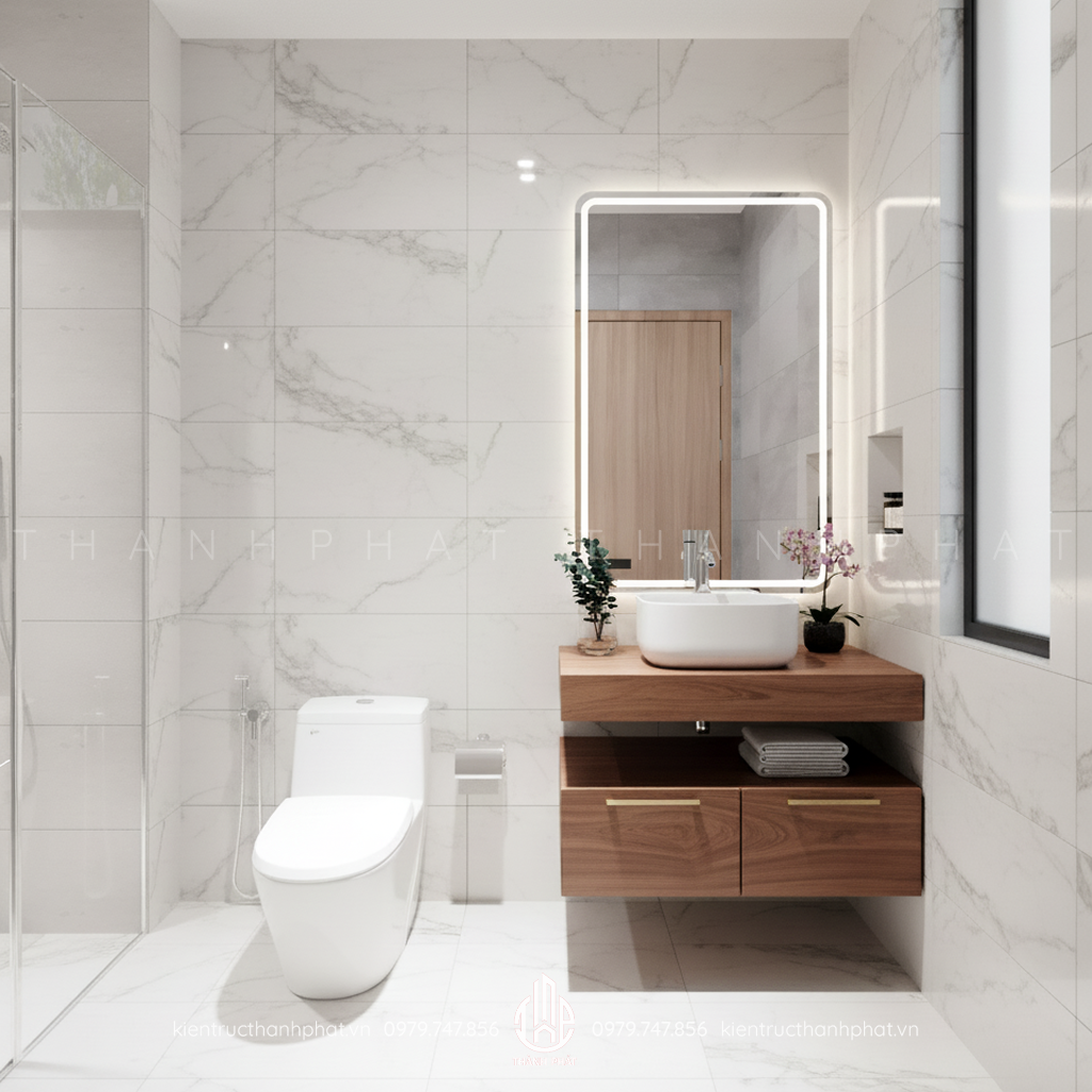 Ngoài ra, sự kết hợp giữa ánh sáng tự nhiên và hệ thống đèn LED âm trần tạo nên một không gian thư giãn lý tưởng, giúp gia chủ giải tỏa căng thẳng sau một ngày dài. Đây không chỉ là nơi phục vụ nhu cầu cơ bản mà còn là không gian chăm sóc bản thân và tái tạo năng lượng mỗi ngày.