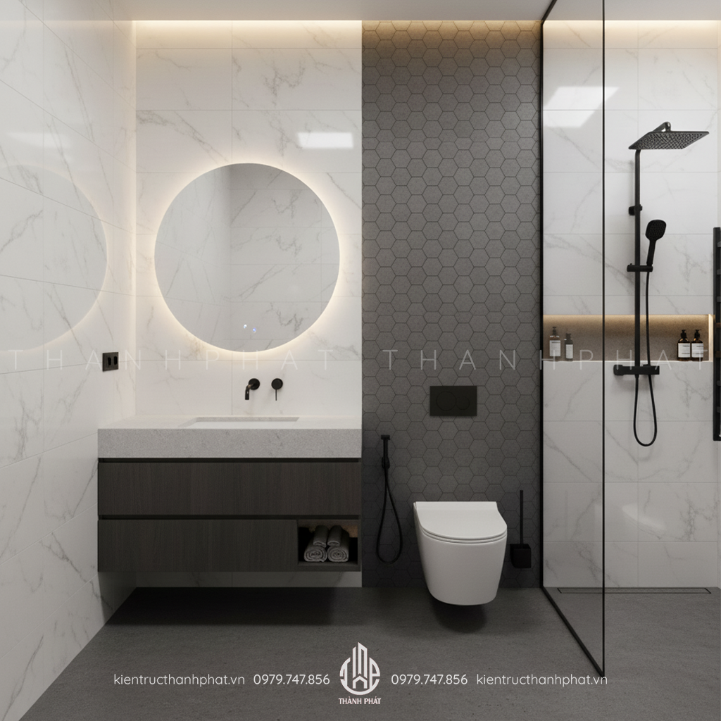 Không gian phòng tắm và nhà vệ sinh được thiết kế theo phong cách hiện đại, đề cao sự thoải mái, tiện nghi nhưng vẫn đảm bảo tính thẩm mỹ. Các khu vực vệ sinh được bố trí hợp lý ở cả hai tầng, đảm bảo sự thuận tiện tối đa cho sinh hoạt hàng ngày của gia đình.