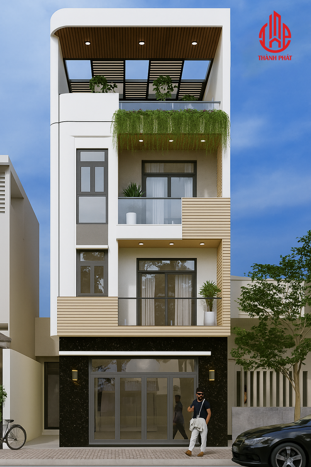 Dưới đây là hình ảnh phối cảnh 3D mặt tiền của mẫu nhà phố 3 tầng 1 tum. Thiết kế hiện đại với các chi tiết kiến trúc tinh tế, ngôi nhà này sẽ trở thành một không gian sống lý tưởng, đáp ứng đầy đủ nhu cầu sinh hoạt và thẩm mỹ của gia đình chị Như.