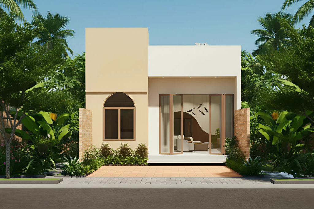 Giữa tổng thể hình khối vuông vắn, ô cửa vòm cong nhẹ trở thành điểm nhấn kiến trúc tinh tế. Chi tiết này giúp mặt tiền bớt khô cứng, đồng thời tạo cảm giác gần gũi và thân thiện hơn. Sự kết hợp giữa đường cong mềm mại và hình khối hiện đại mang lại nét độc đáo, giúp mẫu nhà cấp 4 trở nên khác biệt nhưng không phô trương.