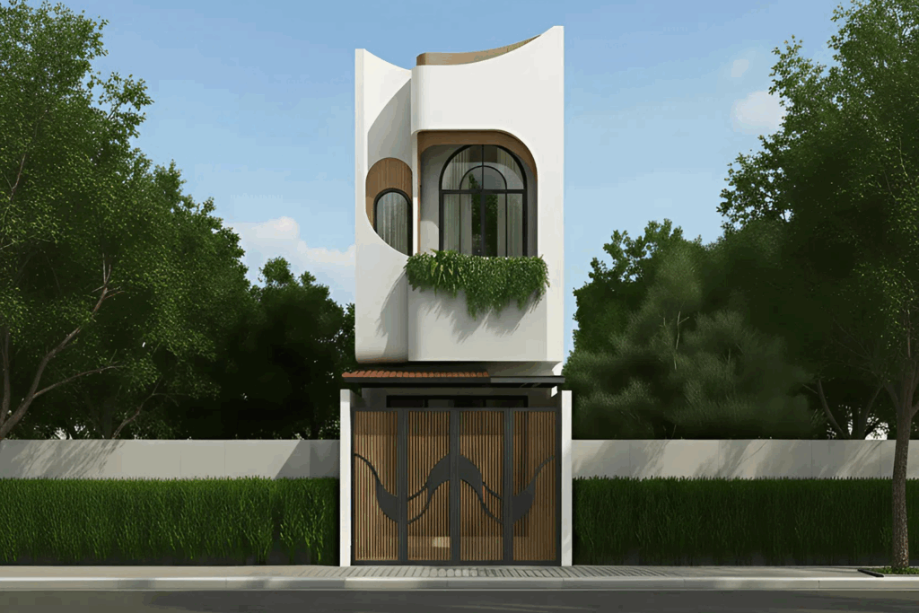 Giữa nhịp sống thành thị năng động, mẫu nhà phố 2 tầng hiện đại này hiện lên như một làn gió mới nhẹ nhàng, tinh tế mà đầy cảm xúc. Từ góc nhìn tổng thể, hình khối ngôi nhà được tổ chức mạch lạc, tối giản, nhưng không hề khô cứng nhờ vào những đường bo cong mềm mại ôm lấy mặt tiền. Chính sự uyển chuyển ấy đã tạo nên dấu ấn nghệ thuật riêng, khiến công trình trở thành điểm nhấn nổi bật giữa dãy phố.