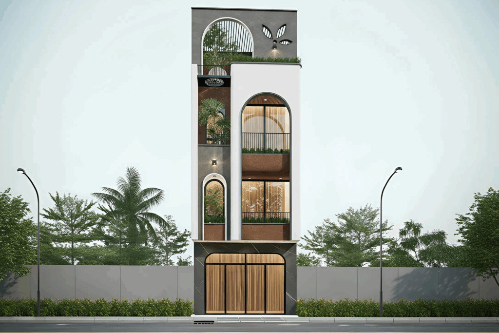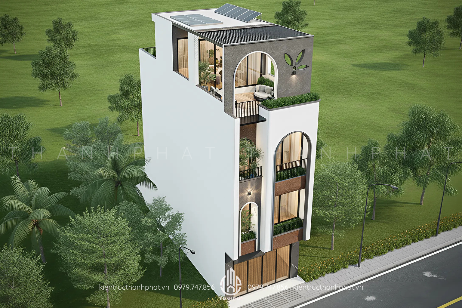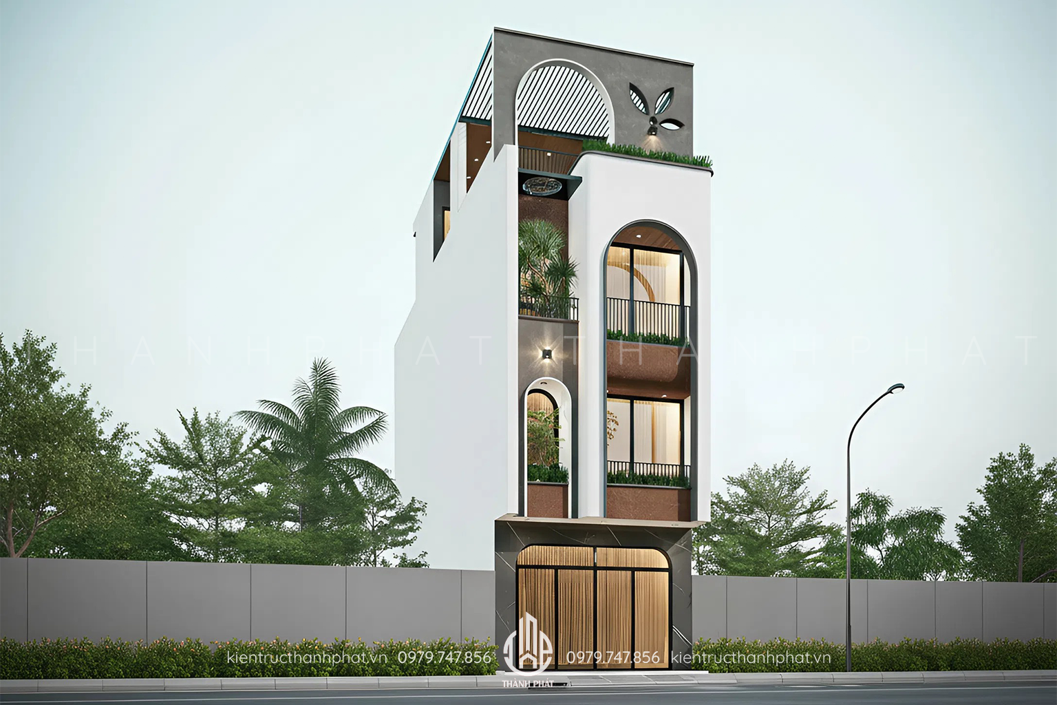 Với kích thước 5x20m, ngôi nhà được tổ chức công năng khoa học theo chiều cao, tận dụng tối đa từng mét vuông sử dụng. Tầng 1 bố trí khu vực sinh hoạt chung và đón tiếp với cửa kính lớn sang trọng; tầng 2 và 3 là không gian phòng ngủ – phòng làm việc với hệ cửa vòm hướng ra ban công xanh; tầng 4 được thiết kế mở hơn với phòng sinh hoạt gia đình hoặc phòng thờ kèm sân thượng thoáng đãng. Những ban công nhỏ bố trí xuyên suốt các tầng không chỉ mang tính thẩm mỹ mà còn giúp công trình đón gió, đón sáng tự nhiên rất hiệu quả.