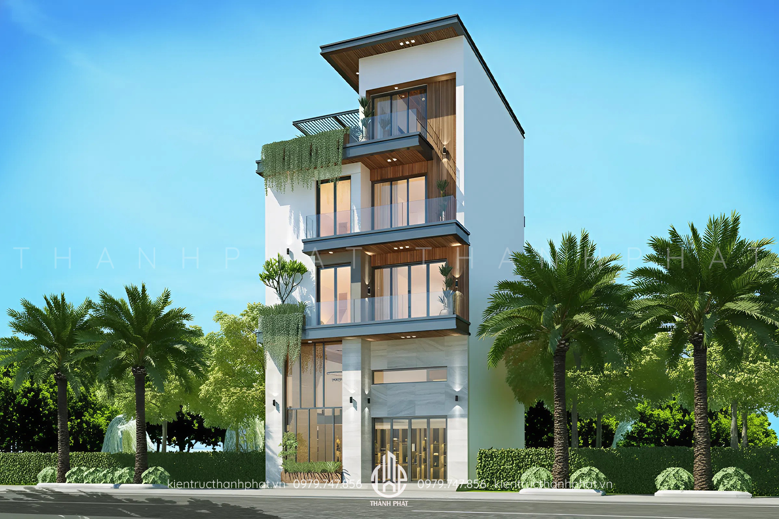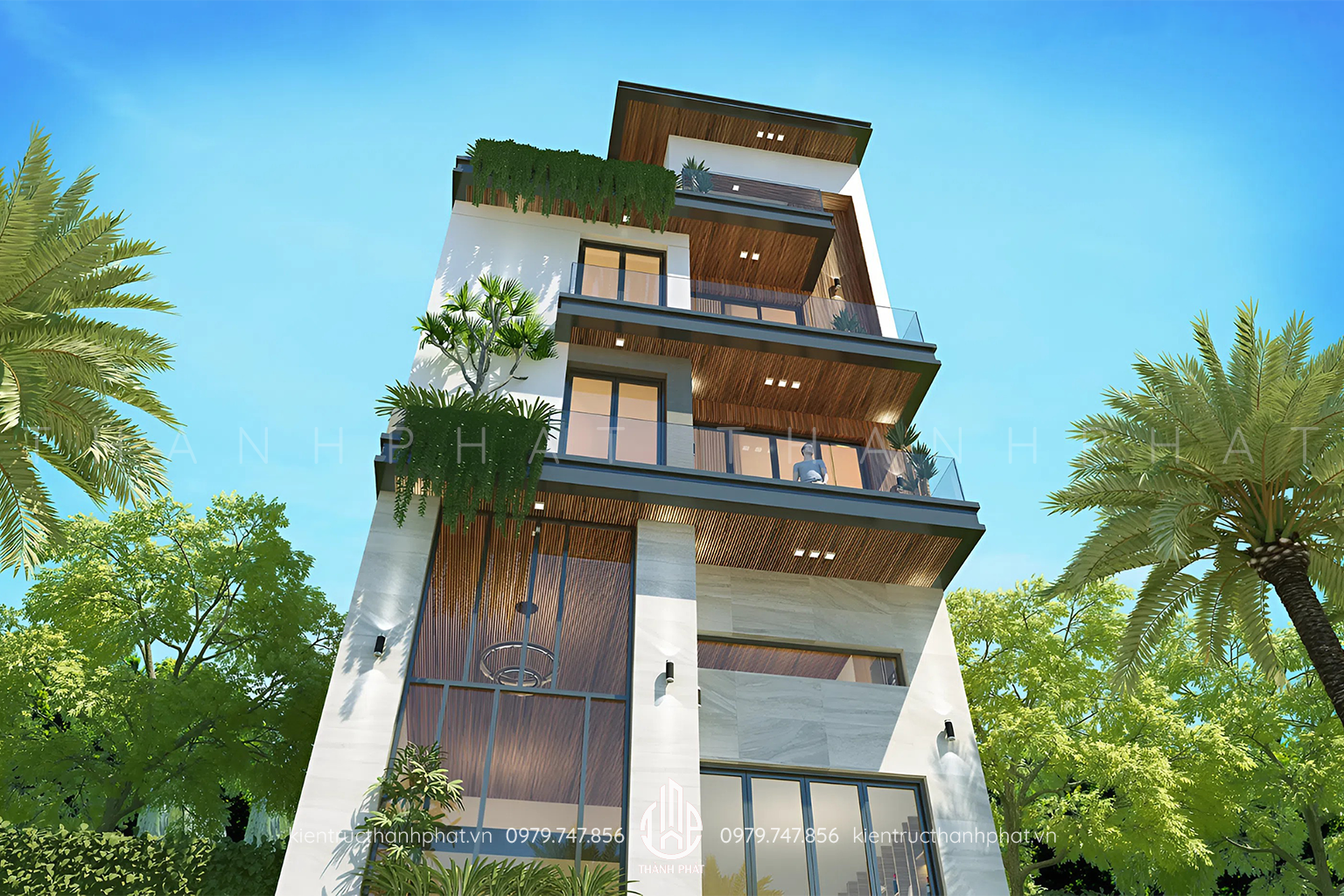 Công trình được thiết kế sở hữu diện mạo hiện đại, thanh thoát nhưng đủ khác biệt để nổi bật giữa dãy phố. Công trình được tạo hình theo ngôn ngữ kiến trúc tối giản đương đại, bố cục khối rõ ràng, mạch lạc theo phương đứng – rất phù hợp với mặt tiền 5m tại đô thị. Các tầng được xử lý đua ban công hợp lý, tạo chiều sâu cho mặt tiền, vừa tăng diện tích sử dụng, vừa mang lại cảm giác cao ráo, bề thế mà không nặng nề.
