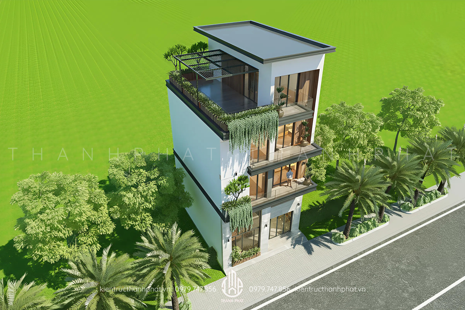 Một trong những điểm thu hút nhất của mẫu nhà này chính là hệ ban công kính cường lực trong suốt kết hợp cây xanh bố trí xuyên suốt từ tầng 2 đến tầng tum. Thiết kế này giúp mặt tiền trở nên nhẹ nhàng, thoáng đãng và hiện đại hơn, đồng thời tối ưu ánh sáng tự nhiên cho toàn bộ không gian bên trong. Cây xanh rủ mềm mại ở ban công và sân thượng không chỉ đóng vai trò trang trí mà còn giúp giảm bức xạ nhiệt, tạo vi khí hậu mát mẻ – đặc biệt phù hợp với nhà phố kinh doanh tại khu vực đông đúc.