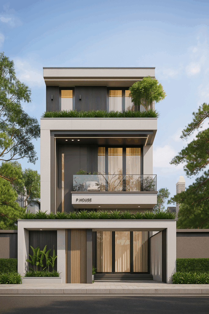 Với hình khối kiến trúc rõ ràng và tinh gọn, mẫu nhà phố hiện đại 3 tầng mái bằng là đại diện tiêu biểu cho xu hướng thiết kế nhà ở đô thị ngày nay. Không cầu kỳ trong chi tiết trang trí, công trình gây ấn tượng nhờ tỷ lệ hình khối hợp lý, màu sắc trung tính hiện đại và cách tổ chức không gian thông minh – tất cả đều được triển khai với tư duy thực tiễn và thẩm mỹ kiến trúc rõ rệt.