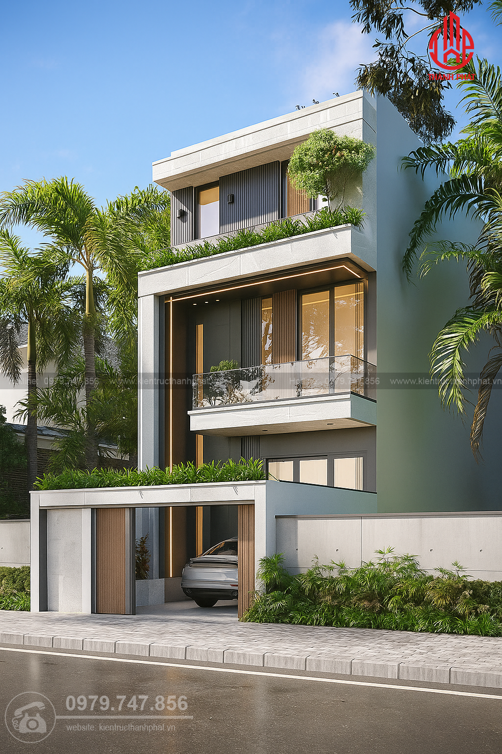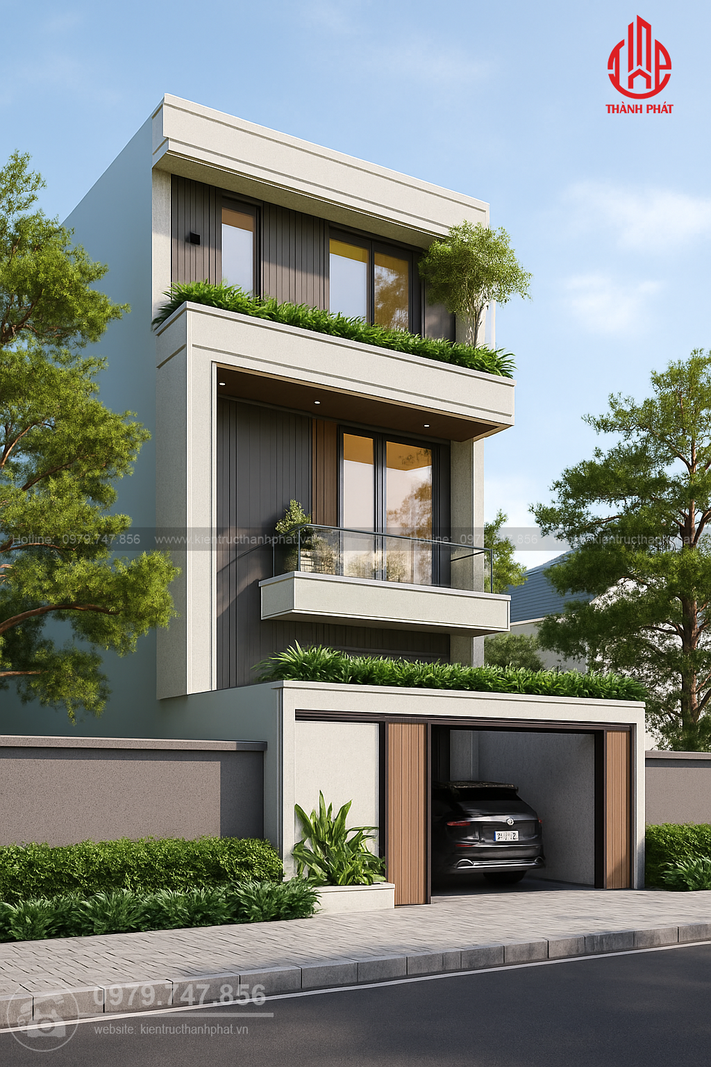 Tầng trệt được thiết kế gara ô tô riêng biệt, kết hợp sảnh đón và không gian sinh hoạt khép kín. Các tầng trên phân bổ khoa học giữa phòng khách, bếp, phòng ngủ và khu vực sinh hoạt chung. Đặc biệt, các không gian ngoài trời như ban công và sân thượng được khai thác triệt để như khoảng thư giãn xanh mát, đồng thời có thể tích hợp khu vườn nhỏ hoặc khu vực uống trà.