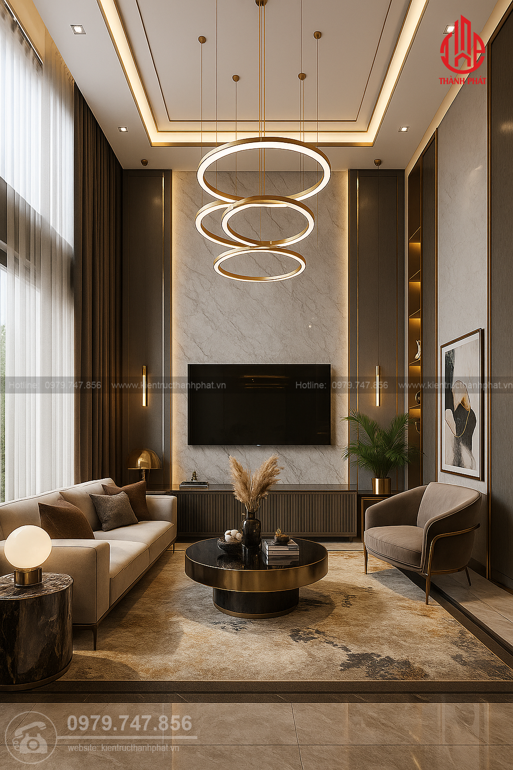 Không gian phòng khách được chăm chút kỹ lưỡng với phong cách hiện đại, tinh giản. Bộ sofa màu trung tính kết hợp bàn trà mặt đá tạo nên trung tâm ấm cúng cho căn phòng. Hệ thống đèn âm trần và đèn thả được thiết kế khéo léo, mang lại ánh sáng dịu nhẹ về đêm, trong khi ánh sáng tự nhiên ban ngày tràn vào từ các khung cửa kính lớn, giúp không gian luôn thoáng đãng và tràn đầy sức sống.