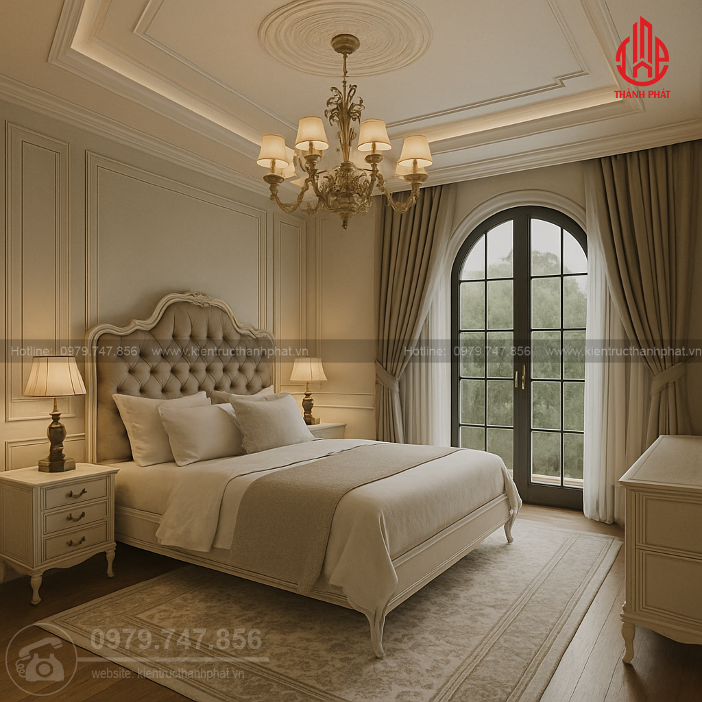 Bước vào phòng ngủ, cảm nhận đầu tiên là sự thư thái và riêng tư – một thế giới tách biệt khỏi nhịp sống hối hả bên ngoài. Thiết kế phòng ngủ trong căn nhà phố tân cổ điển này là sự hòa quyện giữa đường nét mềm mại và vật liệu hiện đại, tạo nên một không gian nghỉ ngơi lý tưởng cho cả gia đình.