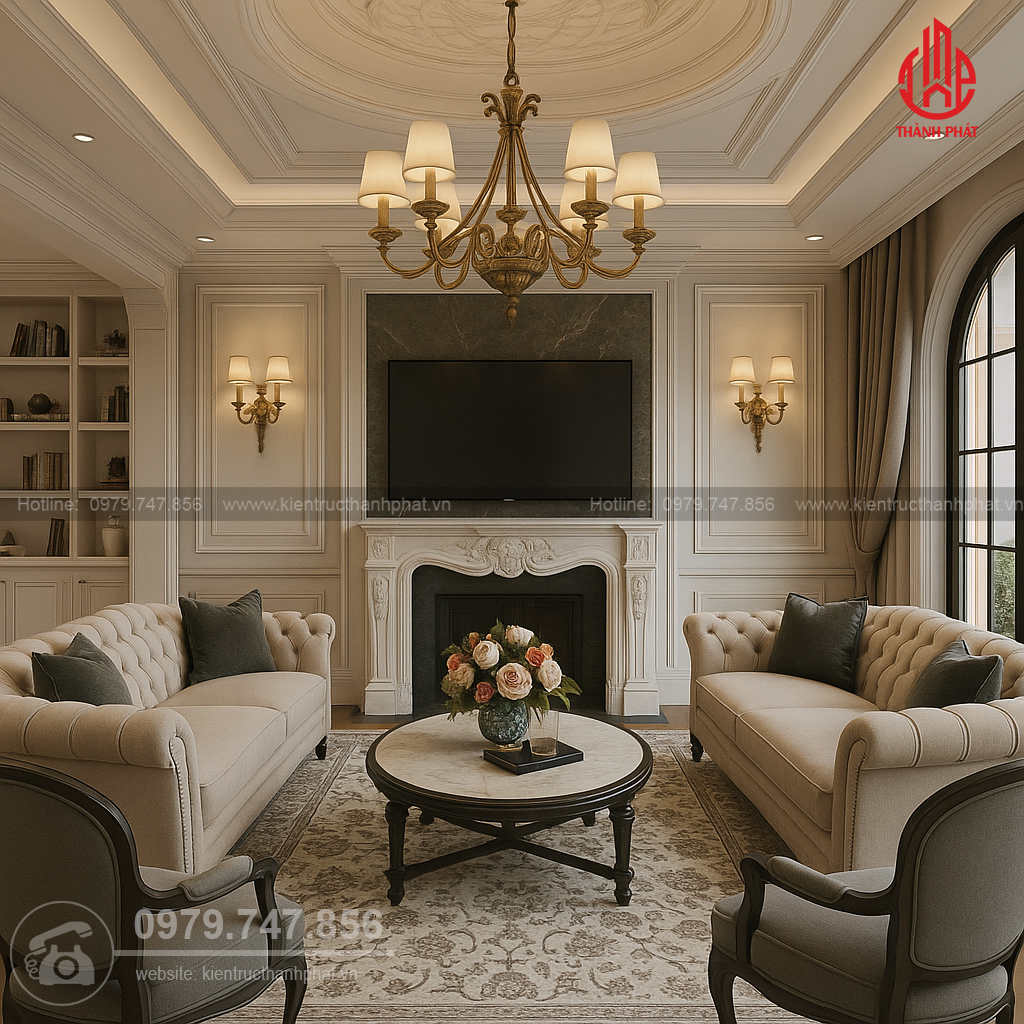 Bước vào không gian phòng khách, cảm giác đầu tiên chính là sự chỉn chu và đầm ấm. Thiết kế nội thất vẫn giữ tinh thần tân cổ điển xuyên suốt – sang trọng nhưng không rườm rà, tinh tế trong từng chi tiết nhỏ.