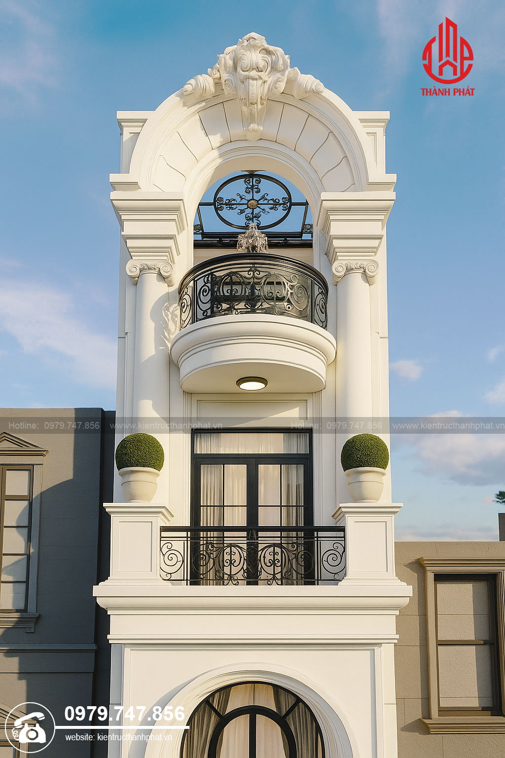 Mặt tiền ngôi nhà được thiết kế theo tỷ lệ vàng của kiến trúc cổ điển, với hệ cột Corinth cao xuyên tầng, kết hợp cùng các vòm cong được đặt đúng trục đứng để đảm bảo tính đối xứng thị giác. Phần ban công sắt mỹ thuật được chế tác thủ công, uốn cong mềm mại theo các họa tiết hoa văn cổ điển, góp phần tạo điểm nhấn mạnh mẽ cho tầng lầu.