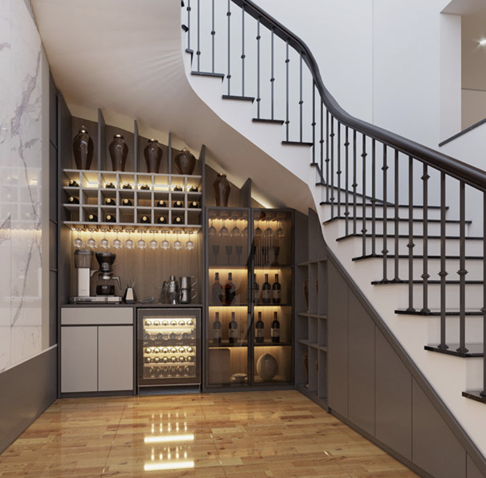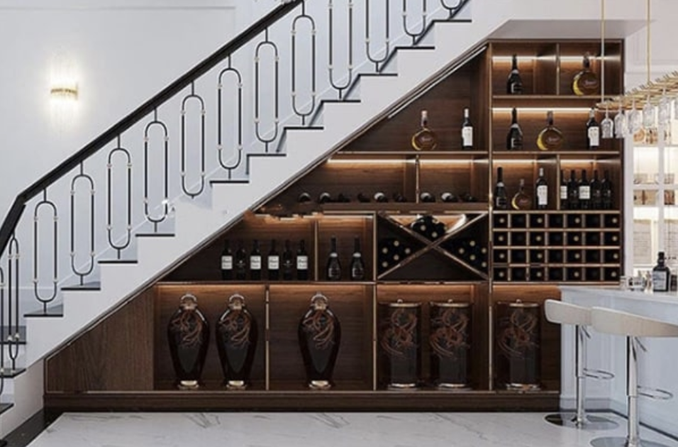 Việc thiết kế, thi công tủ rượu từ khu vực gầm cầu thanh là ý tưởng hay giúp phần diện tích gần như bị bỏ quên trở thành nơi lưu trữ rượu độc đáo. Bạn có thể tận dụng các ngăn tủ để sắp xếp rượu một cách khoa học, từ đó tạo sự ngăn nắp, gọn gàng hơn.