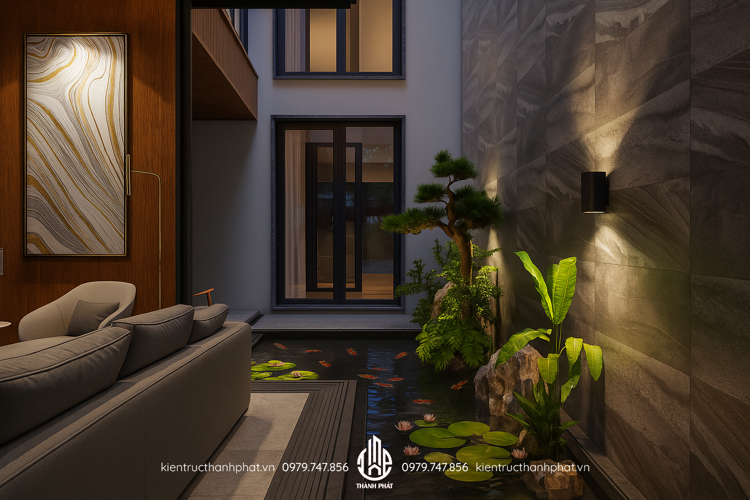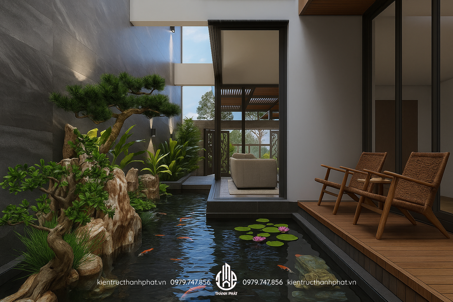 Không gian trung tâm của villa là hồ cá Koi kết hợp với cây bonsai và tiểu cảnh đá, một không gian mang tinh thần thiền định, thư thái, tĩnh lặng nhưng đầy sinh khí. Thiết kế giật cấp sàn gỗ ngoài trời, kết nối trực tiếp từ phòng khách, cho phép gia chủ thư giãn, thưởng trà và hòa mình vào thiên nhiên.