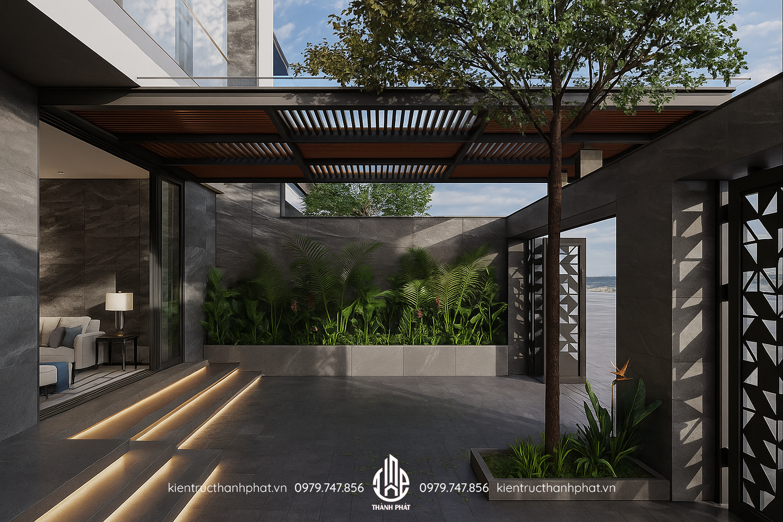 Khoảng sân trước được thiết kế như một khu vườn nhiệt đới thu nhỏ, với bồn cây lớn, hệ lam lấy sáng và lối đi lát đá granite chống trơn. Hệ thống ánh sáng âm bậc được tính toán kỹ lưỡng, vừa thẩm mỹ vừa đảm bảo an toàn.