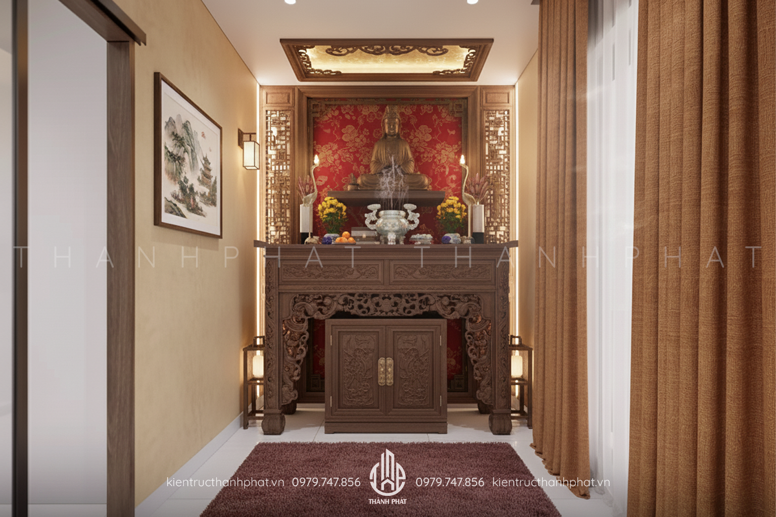 Phòng thờ với nội thất gỗ tạo cảm giác trang nghiêm, ấm cúng