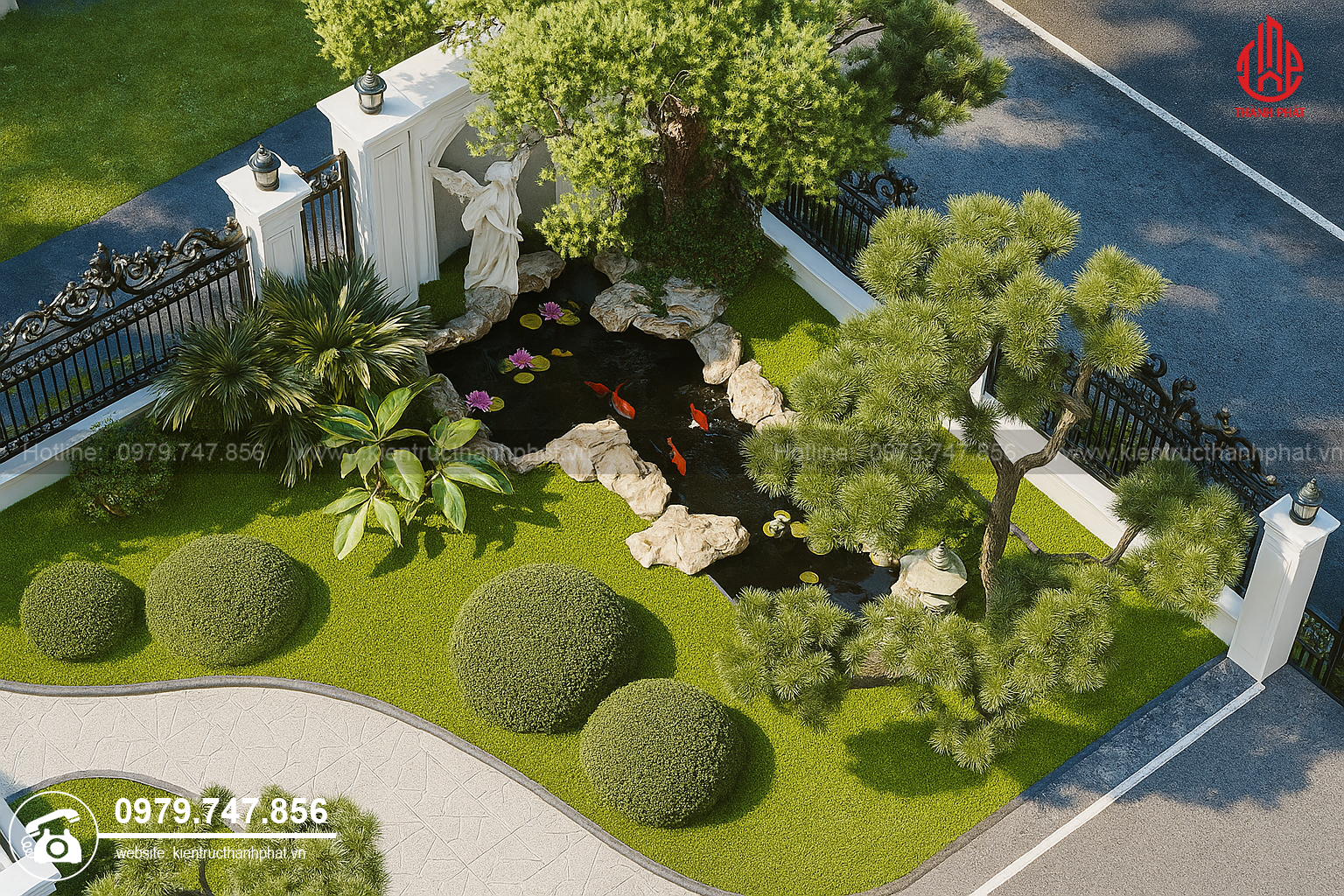 Không gian sân vườn bao quanh biệt thự được chăm chút cẩn thận với cây xanh, tiểu cảnh và hồ cá Koi sinh động. Tất cả cùng tạo nên một khung cảnh nhẹ nhàng, gần gũi, giúp cân bằng nhịp sống hiện đại và mang lại cảm giác thư thái mỗi khi trở về.
