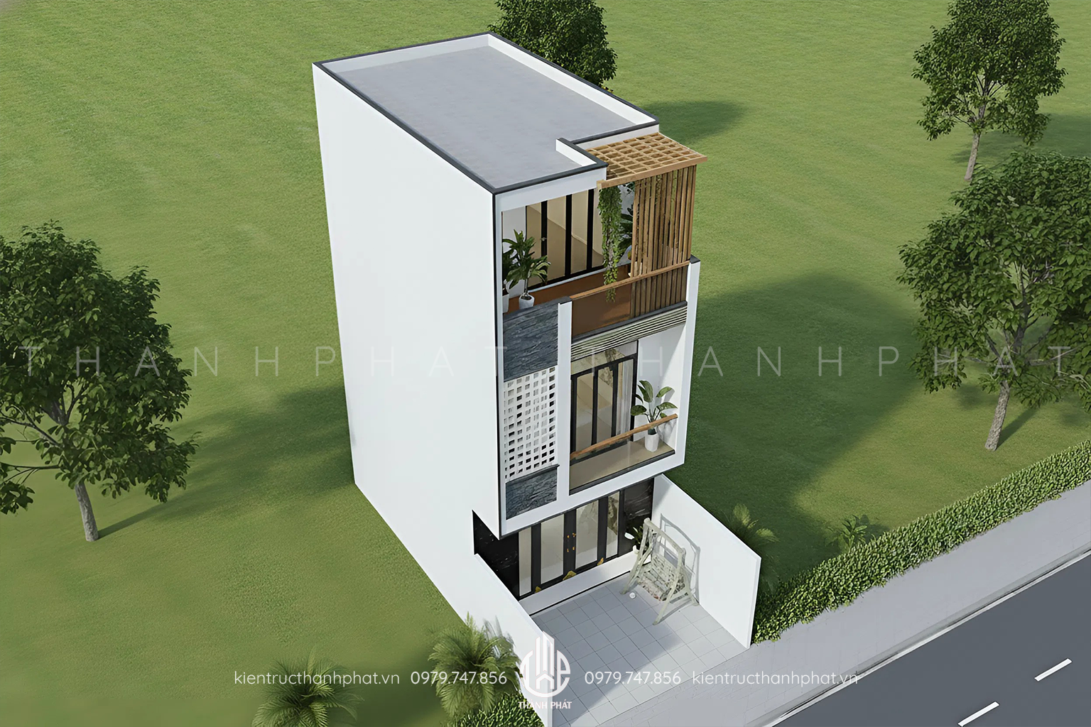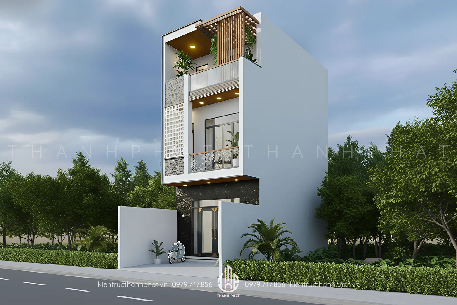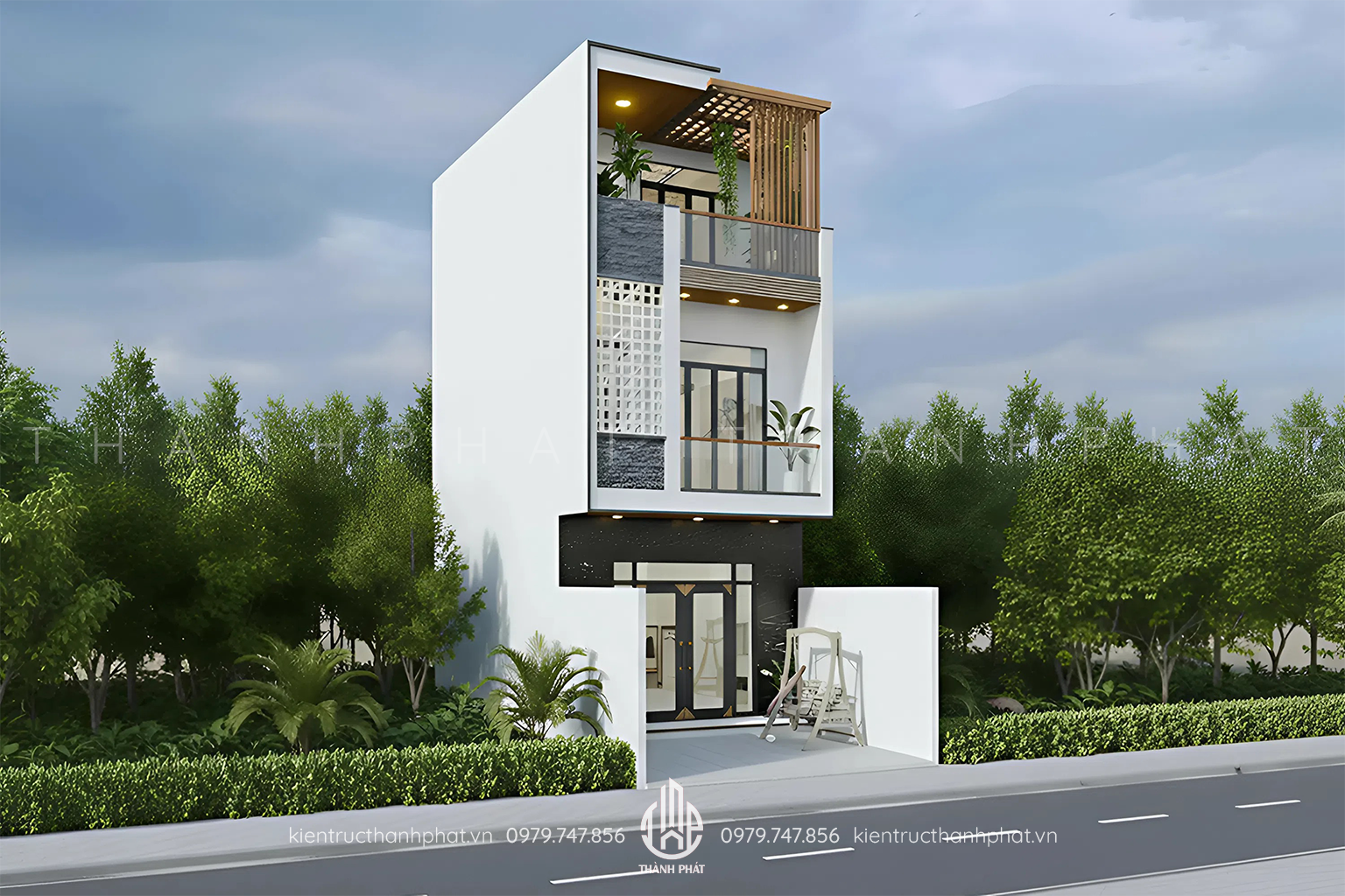 Nhìn từ mặt tiền, mẫu nhà phố 3 tầng mang vẻ đẹp hiện đại, gần gũi thiên nhiên. Những khối hình học rõ ràng, mảng màu tinh tế, cách lựa chọn vật liệu thông minh đã tạo nên một công trình đẹp hài hòa, nổi bật nhưng không phô trương. Kiến Trúc Thành Phát mời bạn cùng khám phá chi tiết thiết kế mặt tiền và bố cục công năng của ngôi nhà này qua bài viết dưới đây.