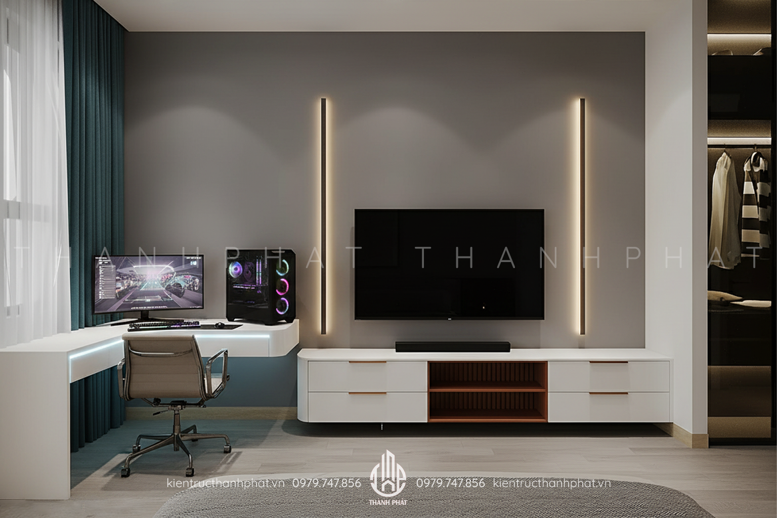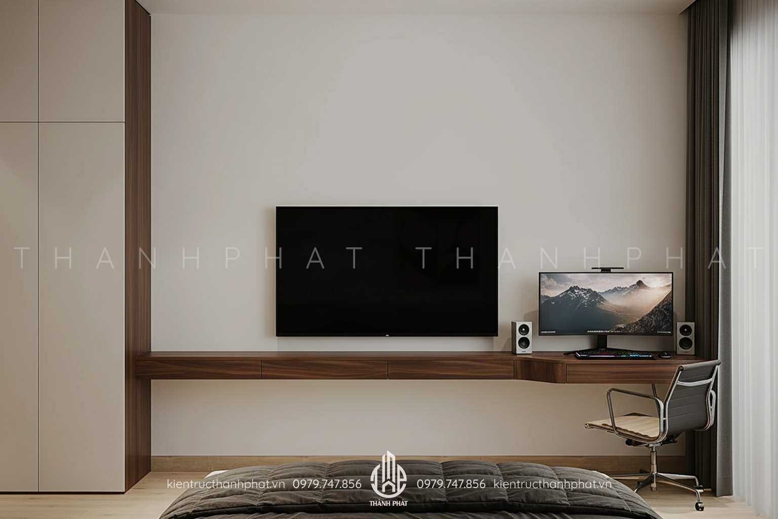 Phòng ngủ master có bàn làm việc, tủ quần áo và kệ tivei