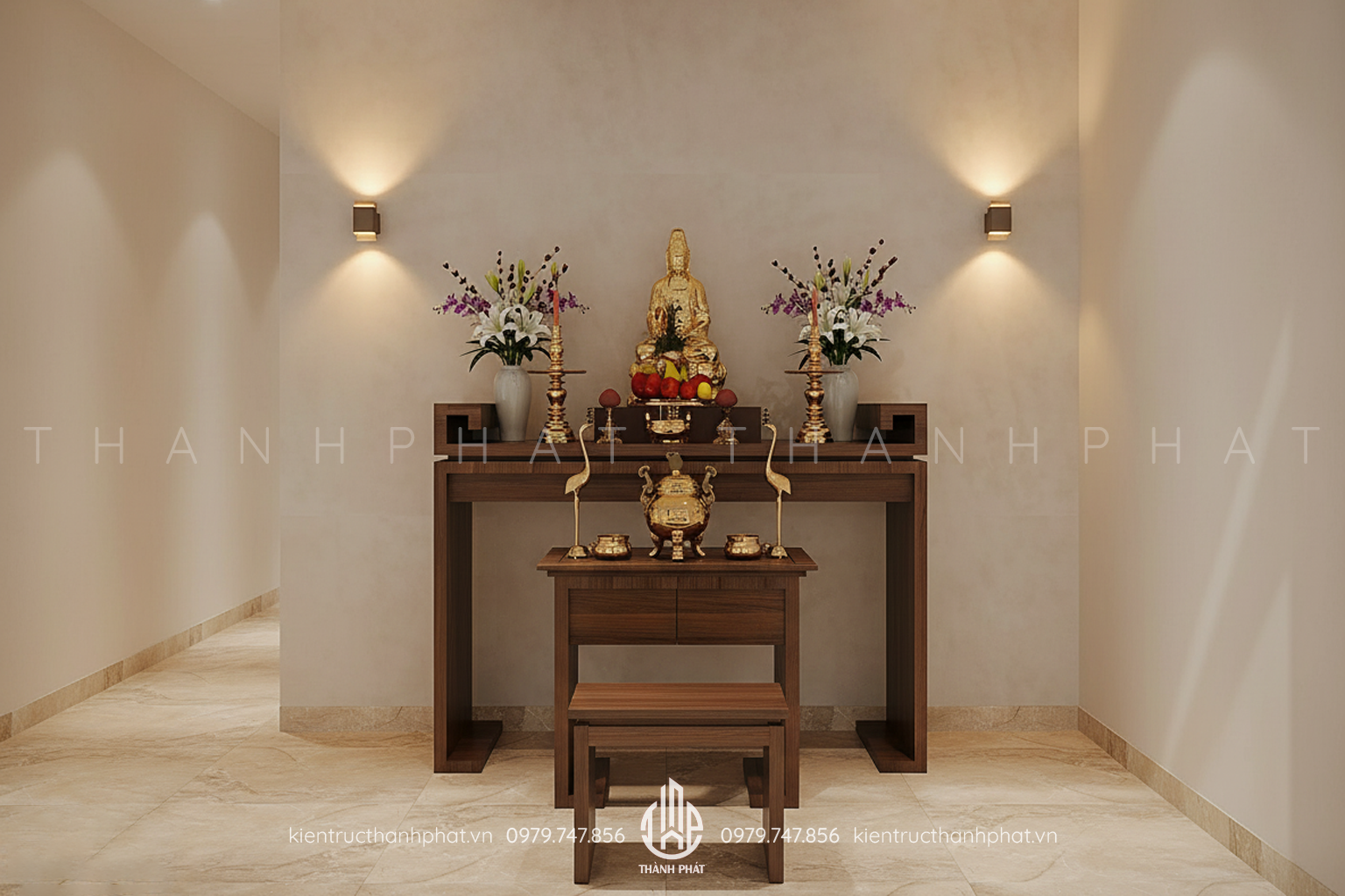 Bàn thờ với nội thất gỗ mang cảm giác ấm cúng