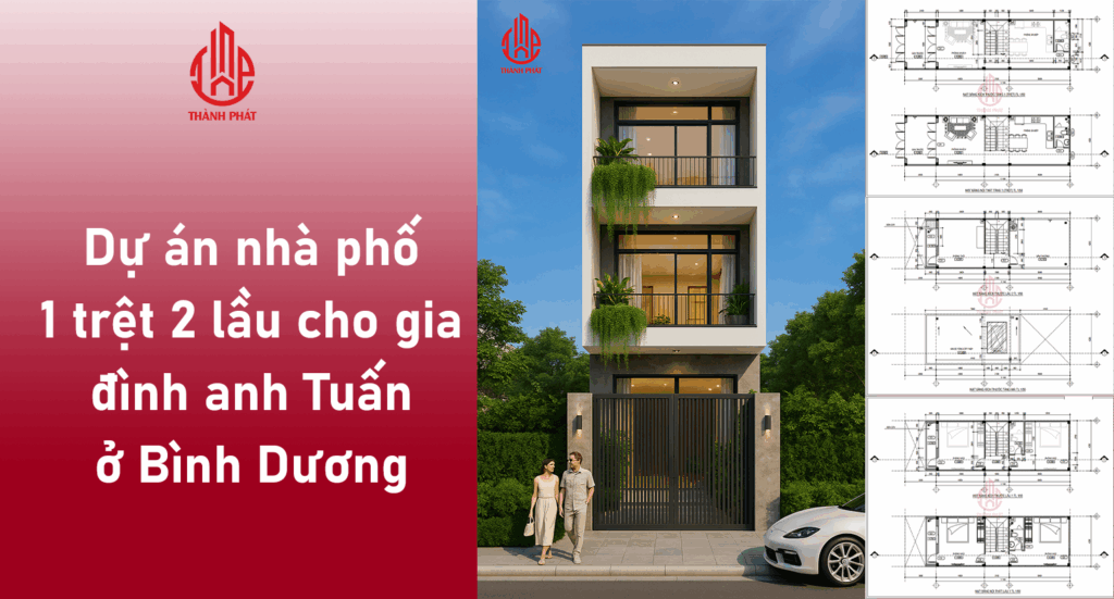 Công trình được thiết kế và thi công bởi Kiến Trúc Thành Phát, với chủ đầu tư là anh Tuấn tại Bình Dương. Ngôi nhà gồm 1 trệt, 2 lầu và sân thượng, đáp ứng nhu cầu sinh hoạt của một gia đình 4 đến 5 người.