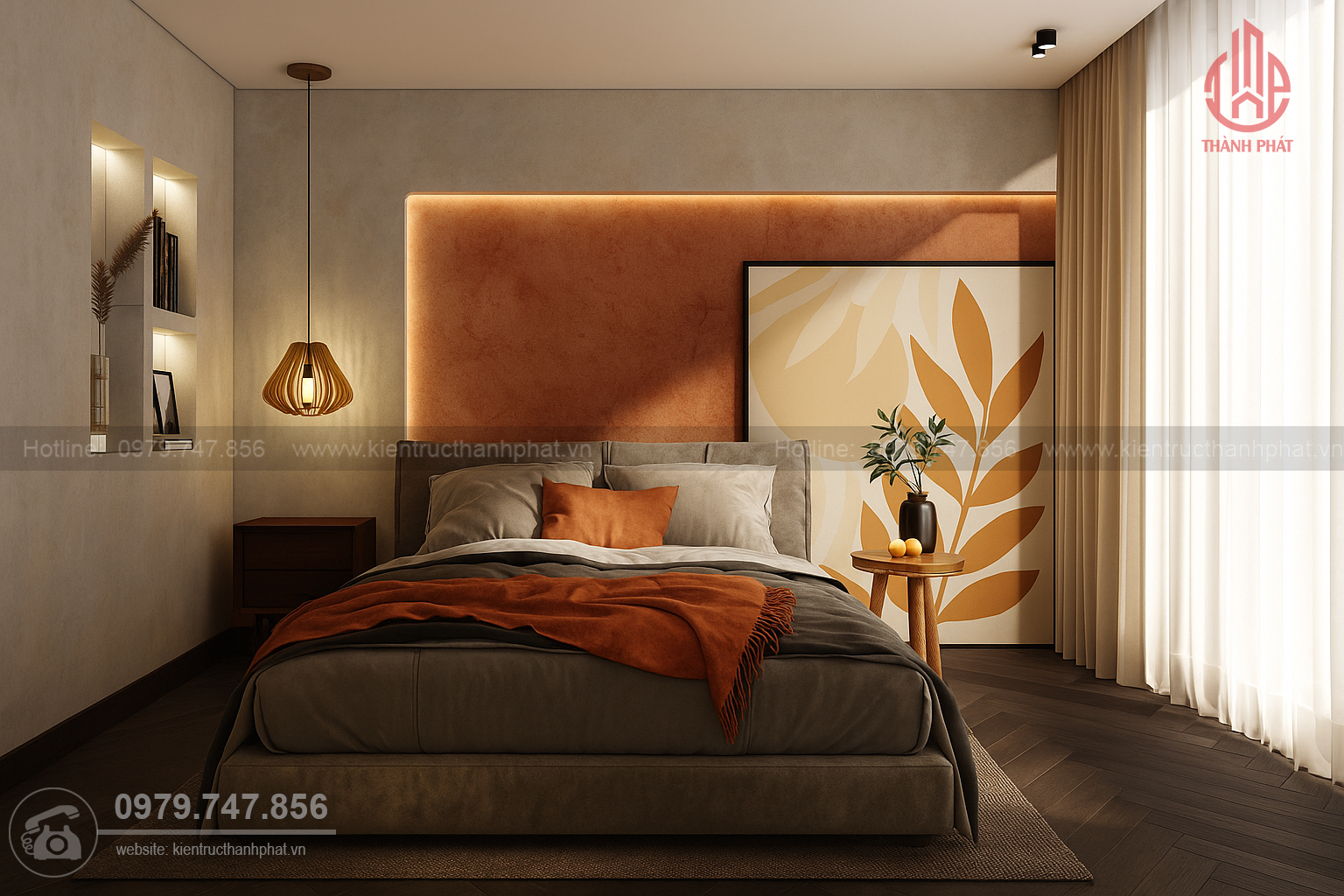 Phòng ngủ sẽ là không gian được thiết kế đột phá nhất trong toàn bộ căn nhà. Vẫn theo đúng dòng chảy trong nguyên tắc thiết kế căn hộ, phòng ngủ chủ yếu sử dụng màu be nhưng tạo điểm nhấn đột phá với khoảng tường màu cam cực kỳ bắt mắt.