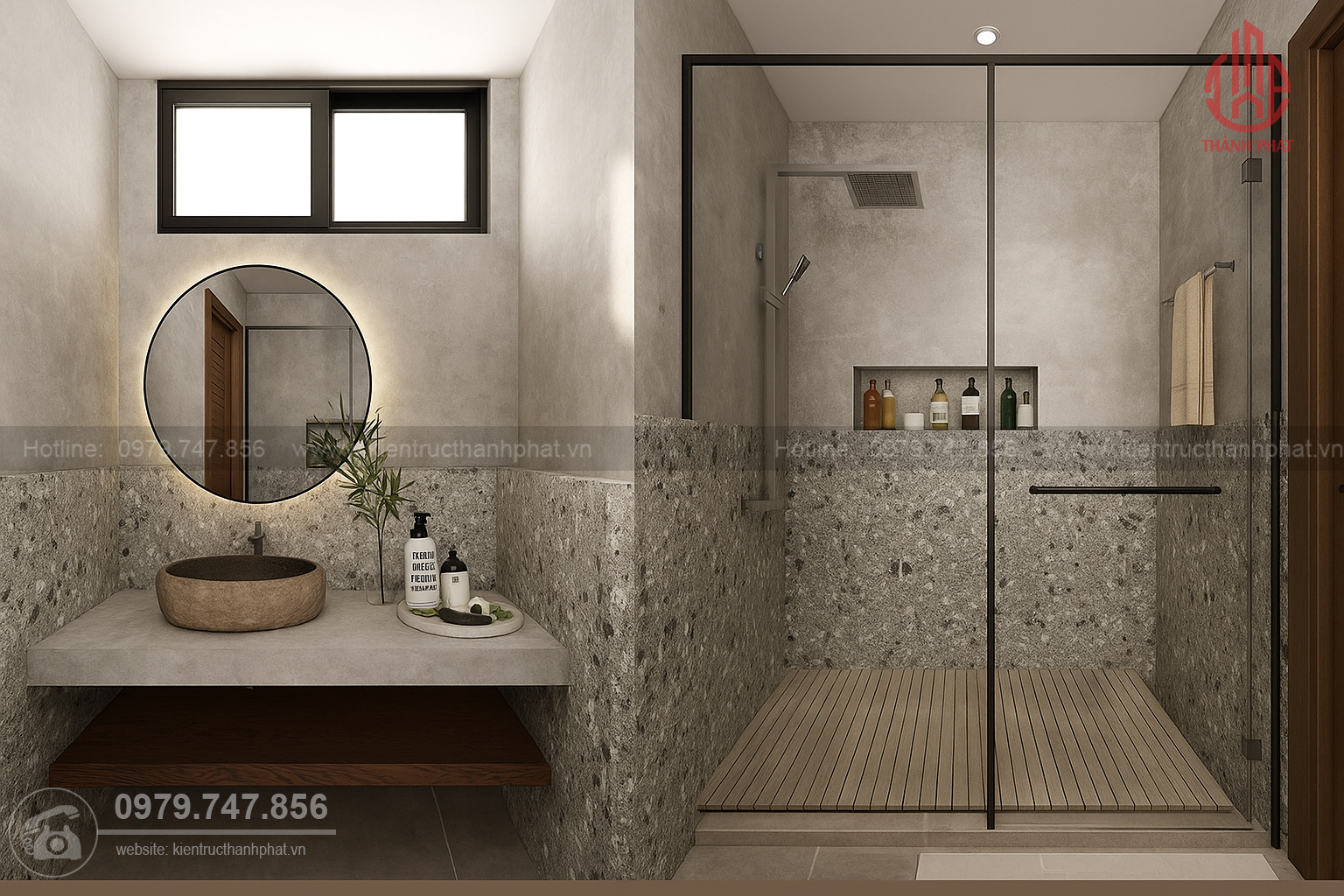 Phòng tắm cũng mang theo hơi hướng của sự tối giản, không gian sử dụng bê tông, đá nguyên khối là vật liệu chính với tông màu xám trung tính làm màu sắc chủ đạo. Bàn lavabo bằng đá thiết kế độc đáo, vừa đảm bảo công năng sử dụng và có tính thẩm mỹ cực cao. Khu vực tắm sử dụng vách kính phòng tắm hiện đại, giúp phân chia rõ ràng giữa hai khu vực nên vệ sinh và tiện lợi khi sử dụng.