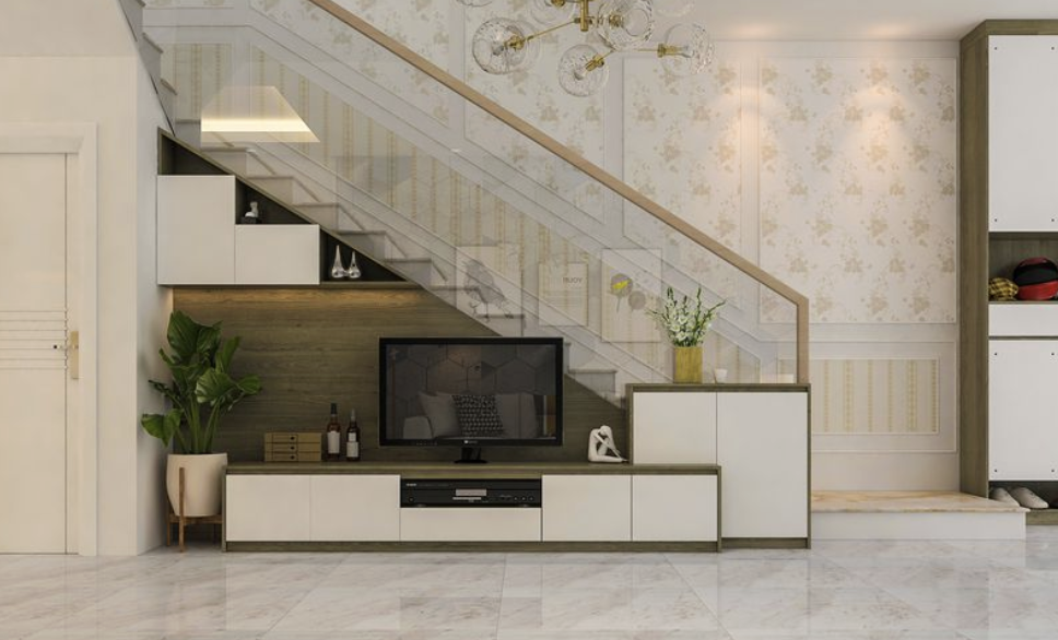 Tủ gầm cầu thang tích hợp kệ tivi hiện đại, thu hút mọi ánh nhìn